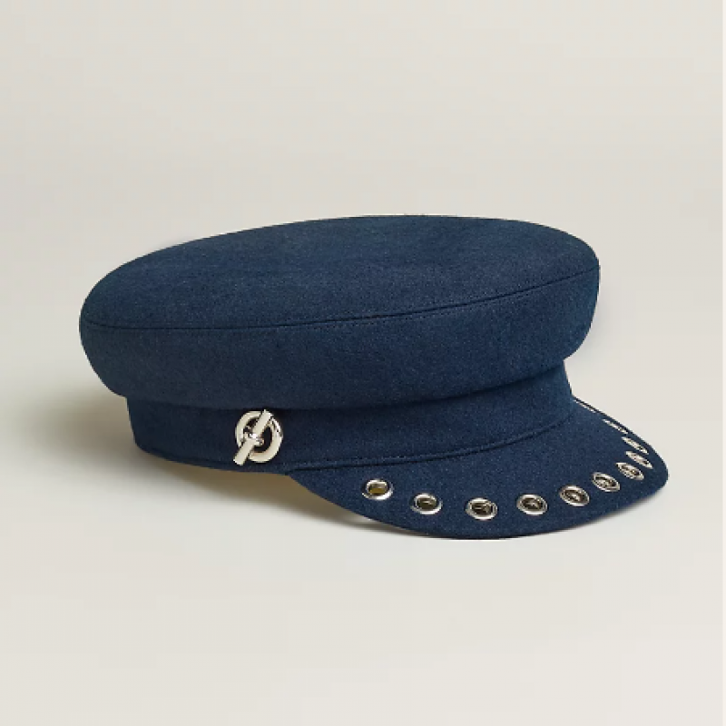 輕盈海軍絨面呢女士便帽,鏤孔帽舌配有雙金屬孔眼,內側飾有「Hermès Ancre」徽章。側邊飾有Chaine d'Ancre細節。純色真絲和人造絲內襯。側邊飾有Chaine d'Ancre細節。法國製造。