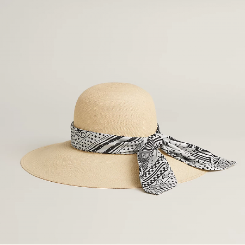 巴拿馬布雷紗女士帽子,斜紋真絲帽帶飾有維吉妮·雅蒙(Virginie Jamin)設計的「曲折鞍帶頭巾」圖案印花。