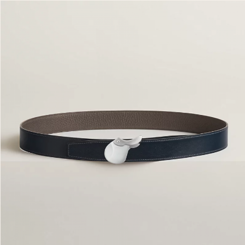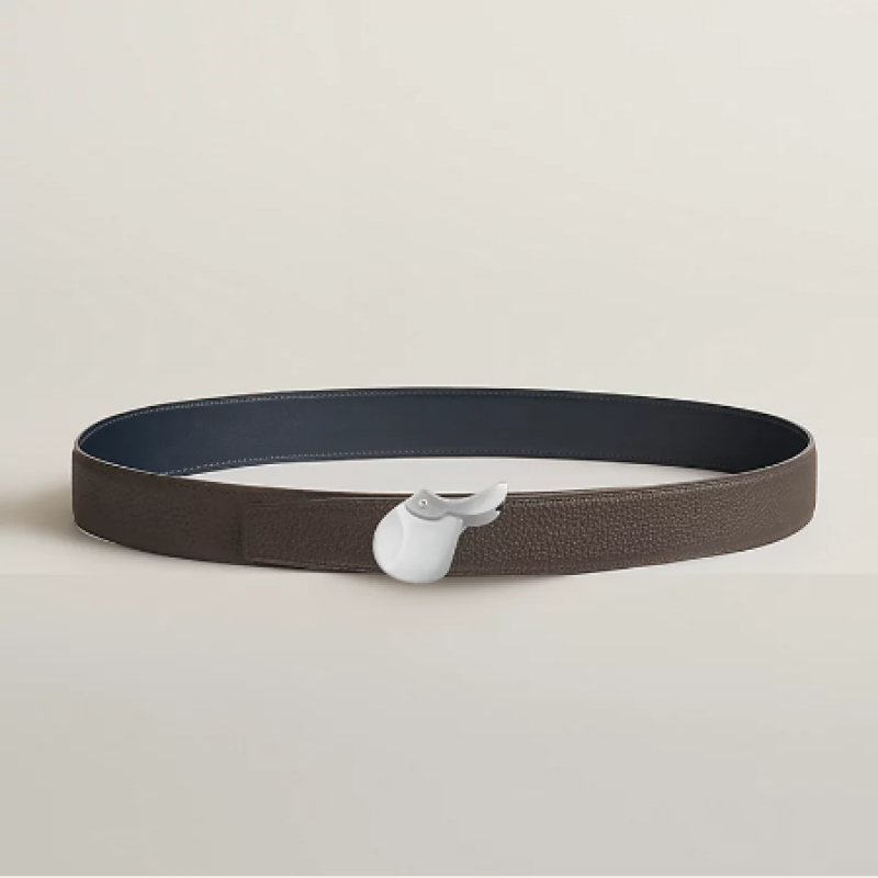 鍍鈀金屬皮帶扣。這款皮帶扣的設計靈感源自Cavale馬鞍,以此向品牌的馬術根源致意。法國製造。& Box 135和Togo小牛皮雙面皮腰帶。法國製造。