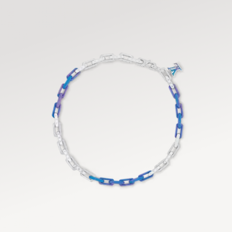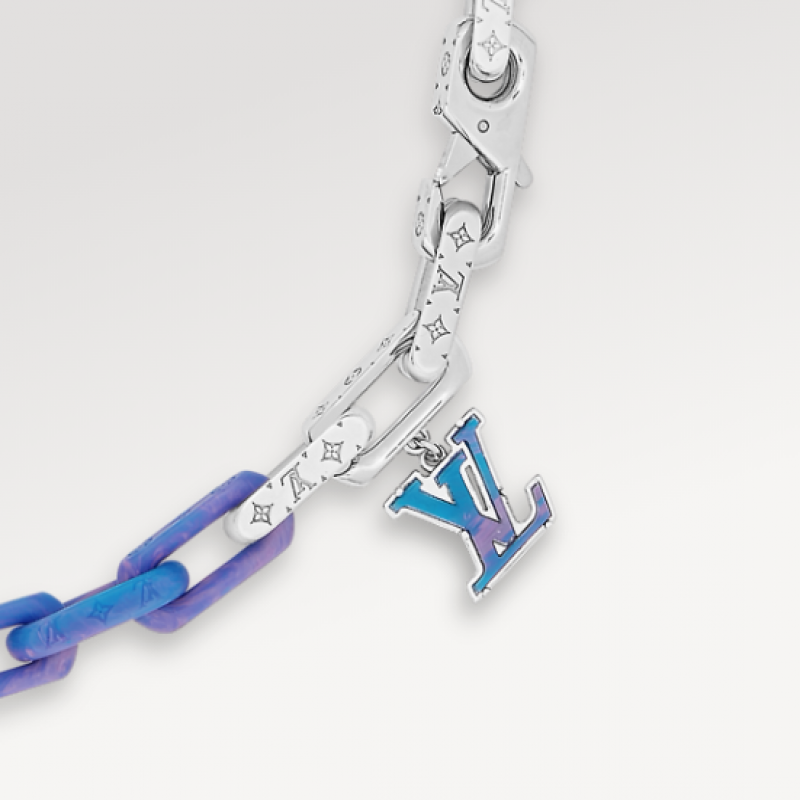 本款Monogram Chain項鍊融合精鋼、有機玻璃和再生樹脂,以個性筆觸展露潮流態度。 金屬鏈環匠心鏤刻Monogram圖案,與靈動LV字母裝潢相互映襯。 同系列另有手鏈可選。